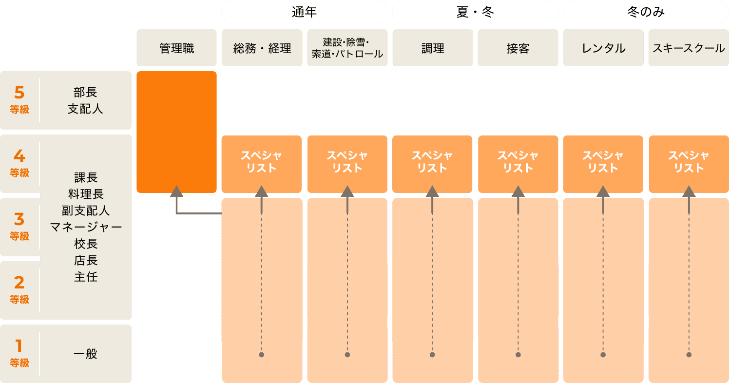 期待される役割や業務のレベル等によって等級を分け、「等級基準書」を元に能力を評価し人事評価を行なっています。また、希望や適性に応じて配属先を決定するため、あなたのなりたい姿をあなたらしく目指すことができます。